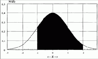 Допустим, нам надо найти площадь под кривой N'(Z) между -1 стандартной единицей и +2 стандартными единицами. Есть два способа расчета. Мы можем рассчитать вероятность, не превышающую +2 стандартные единицы, при помощи уравнения (3.21) и вычесть вероятность, не превышающую -1 стандартную единицу (см. рисунок 3-12). Это даст нам: 0,9772499478 - 0,1586552595 = 0,8185946883